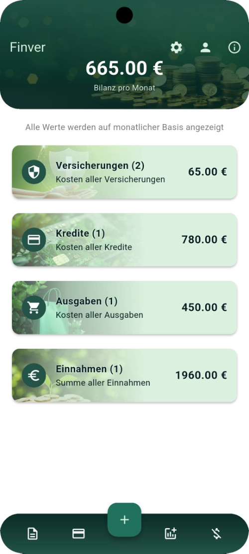 FinVer ist eine moderne Finanzverwaltungs-App, die es dir ermöglicht, deine Einnahmen, Ausgaben, Kredite, Versicherungen